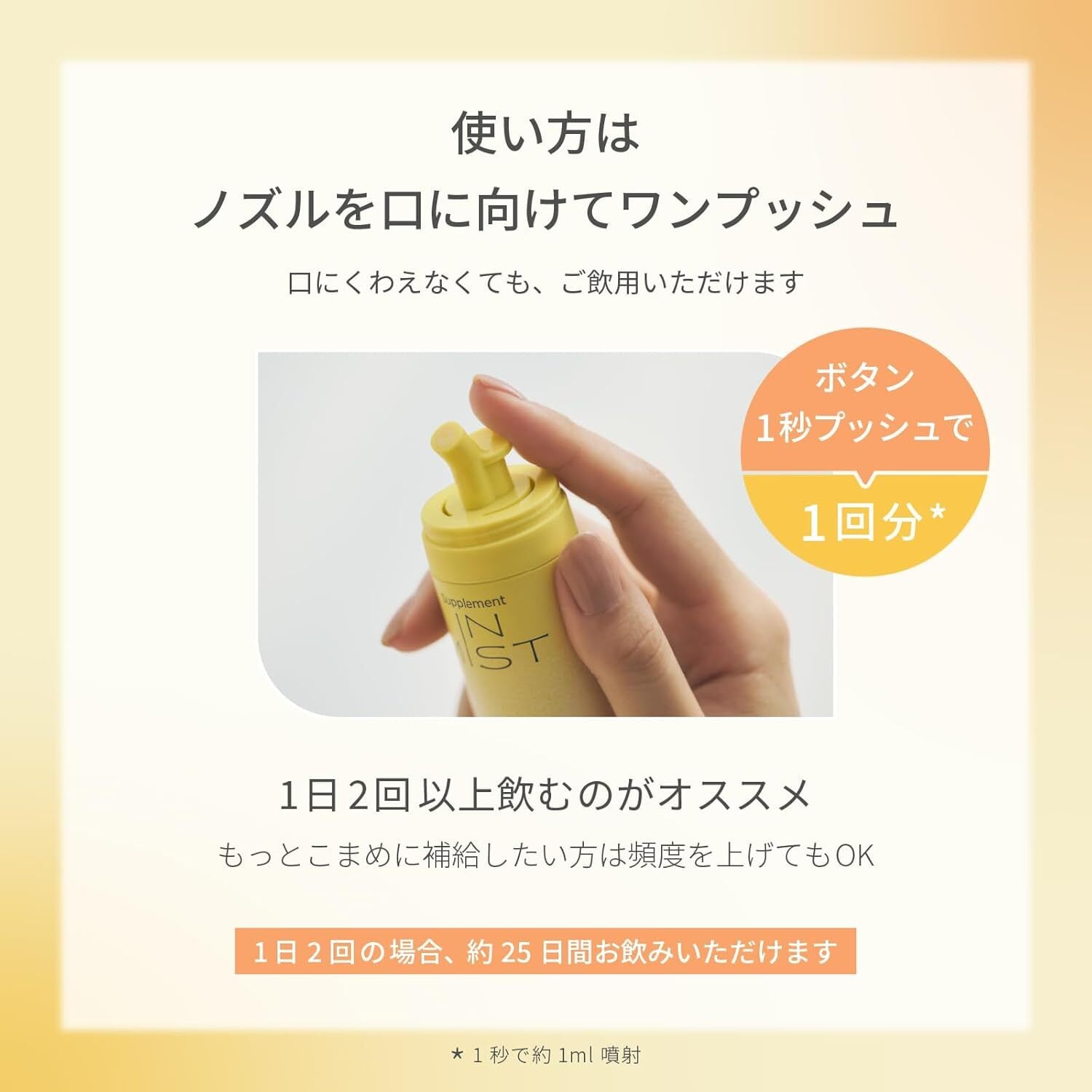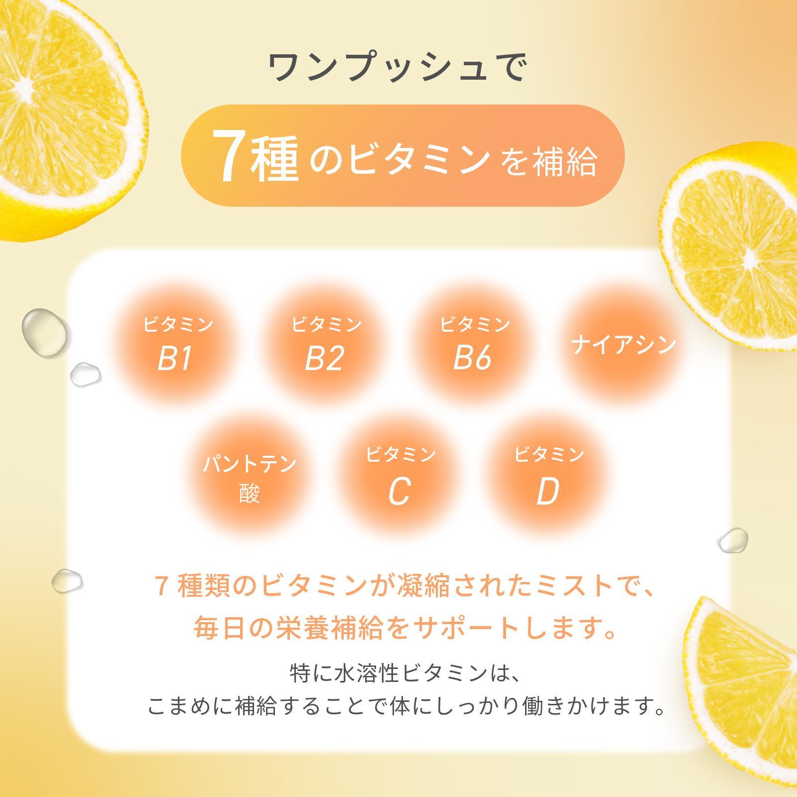 どこでも水無しワンプッシュでおいしく飲めるミスト型サプリメント。ワンプッシュ1mlで1日分のビタミンCとビタミンB群(B1、B6、B12)。シトラスレモンテイスト。